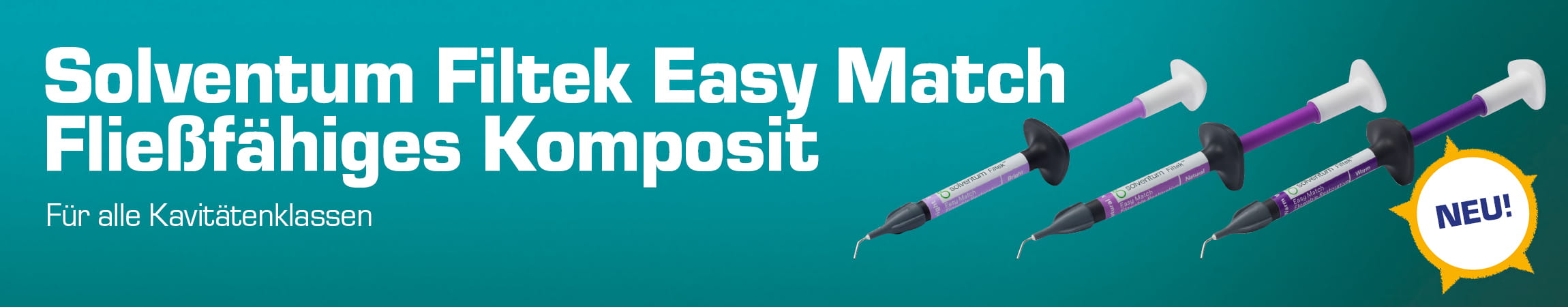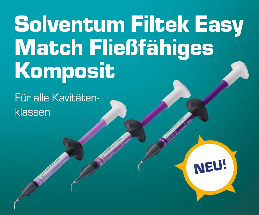 Die Filtek Easy Match fließfähigen Komposite von Solventum sind Ihr verlässlicher Partner für mühelose und ästhetische Zahnrestaurationen. Das fließfähige Komposit revolutioniert den Praxisalltag durch sein innovatives Drei-Farb-System, welches Ihnen eine intuitive und rasche Farbauswahl ermöglicht. Entwickelt, um sowohl im Front- als auch im Seitenzahnbereich exzellente Ergebnisse zu erzielen, bietet es eine natürliche Anpassung der Opazität – so erhalten Sie schmelzähnliche Transluzenz dort, wo es nötig ist, und überall sonst dentinähnliche Opazität ganz ohne Blocker.  Entdecken Sie selber die Top-Qualität des Solventum Filtek Easy Match Flowables bei uns im NETdental Online-Shop!