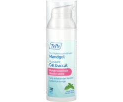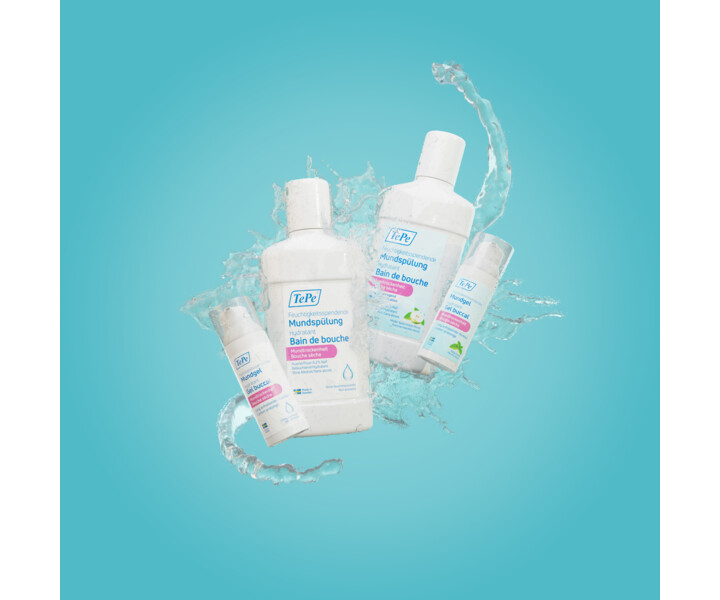 TePe bietet Mundspray, Gel und Spülung, die die Mundschleimhäute befeuchten, den Speichelfluss anregen und die Mundgesundheit unterstützen.