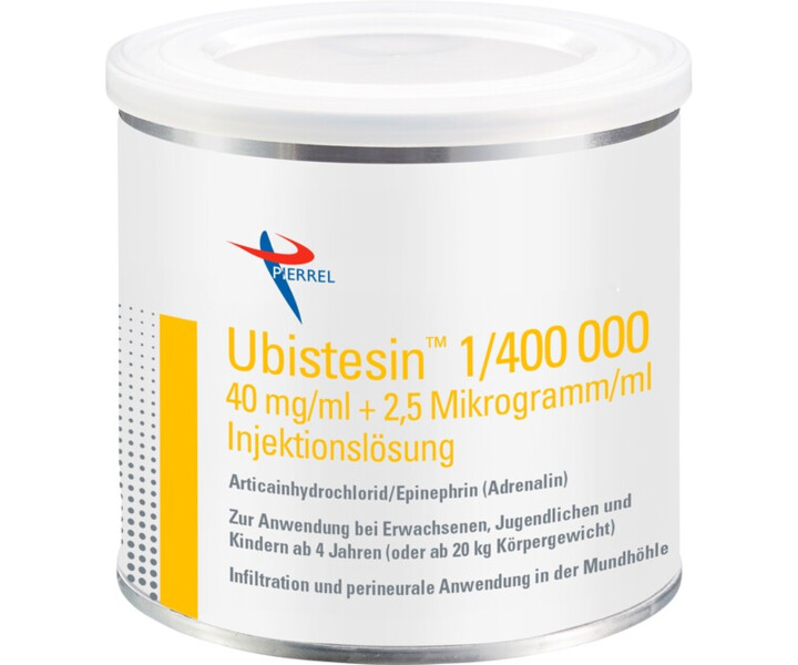 Das Ubistesin 1:400 000 ist auf 4%iger Articain-Basis mit Adrenalin 1:400 000 und es ist parabenfrei. Infiltrations- und Leitungsanästhesie für Routineeingriffe bis zu 30 Minuten. Damit können kleinere zahnmedizinische Eingriffe bei geringer ...